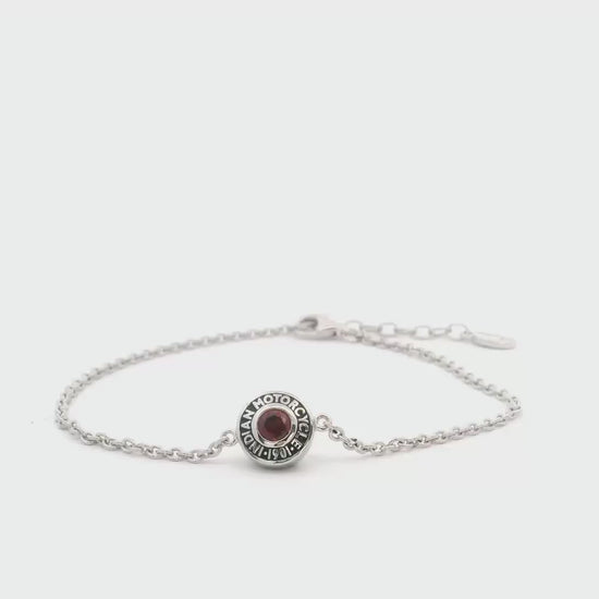Introducing the Rivet & Black Red Bracelet, a captivating accessory crafted from sterling silver. Featuring a vivid red stone set within a unique rivet design, this bracelet adds a bold and stylish touch to any outfit. The sleek chain and secure clasp provide both comfort and durability, making it a standout piece worn alone or in a stack. Crafted in: Sterling Silver Indian Motorcycle® and all related logos, trademarks, and trade names are the property of Indian Motorcycle International, LLC, and are used under license. |